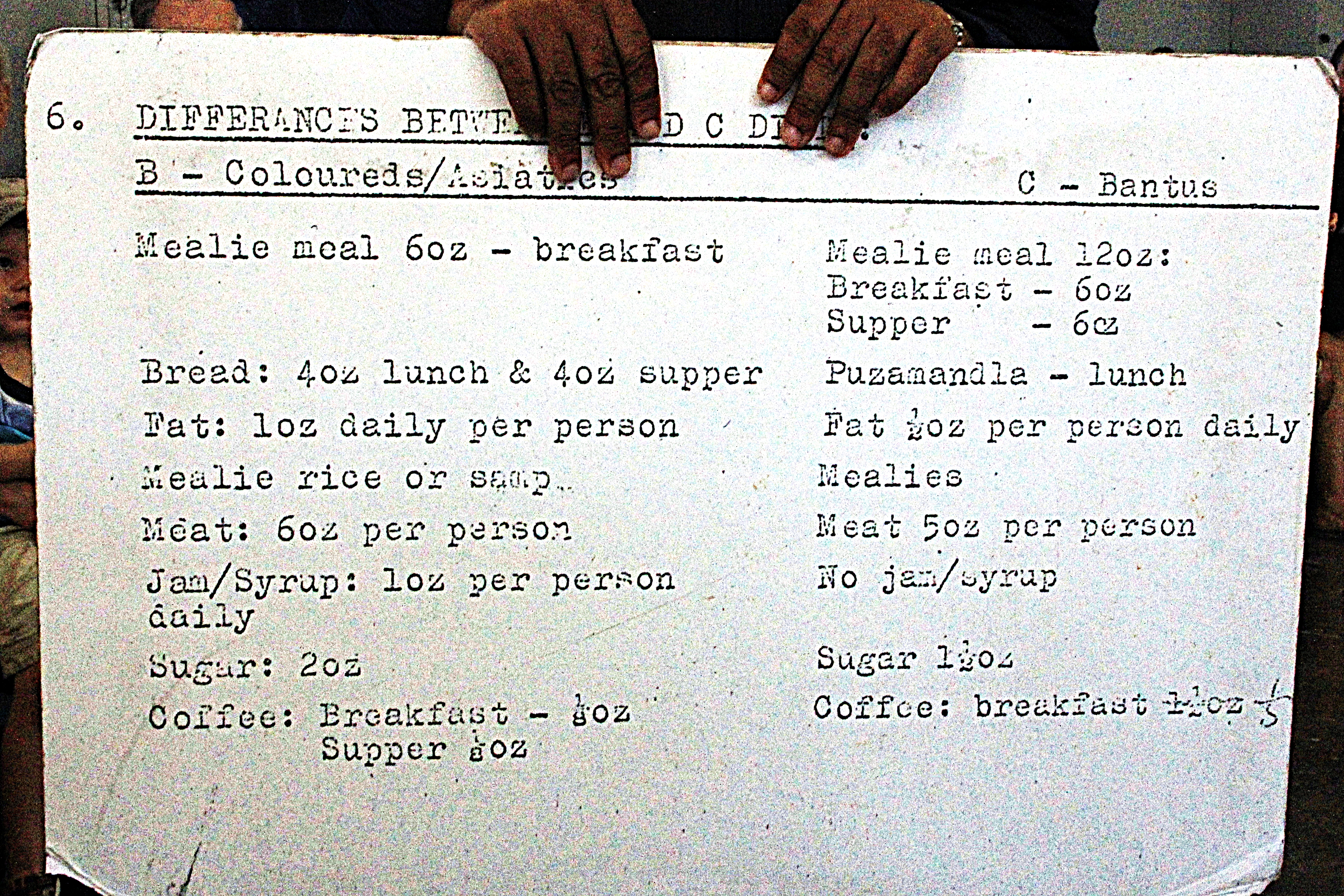 Different diets depending on if you're just "coloured" or really black. Meant to cause friction between prisoners. It didn't work.