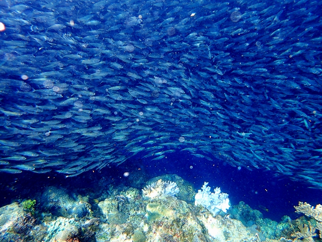The next day we were up early, enjoyed breakfast and asked one of the girls to get us a tricycle. Jessely picked us up and took us to Panagsama beach and gave us a few tips on where to go. It’s no longer a “beach” as the 1984 typhoon took all the sand away but it’s known for great snorkelling. We thought we’d have to hire a boat to Pescador island to see the sardine run but 3 years ago they moved to Pasagsama. Lucky us! After renting fins from the dive shop (we’d brought our own mask and snorkel) we jumped in and were swimming with the sardines. Amazing! More than 3 hours later we’d seen 5 or 6 turtles (including one VERY large male) and more species of fish than I’d ever seen in one place.