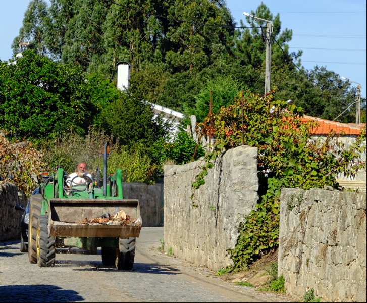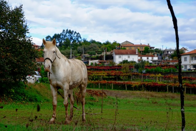 You can’t have sunshine every day. After stuffing our faces full of breakfast courtesy of our host, we headed out in the rain. It took about an hour to get out of Barcelos, after which the rolling countryside became dotted with small villages, lots of fields with winter wheat, some just freshly plowed and many grape vines bearing the last of the shrivelled grapes. I treated myself to an orange from a tree hanging over the road and a lemon from a tree in a church yard. Both were delicious!