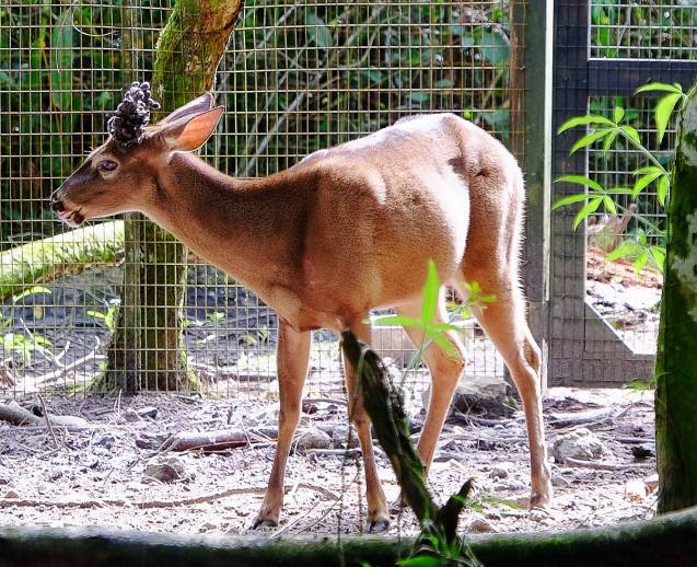 This deer was gelded which caused a hormone imbalance . He doesn’t shed his horns so they’ve become deformed