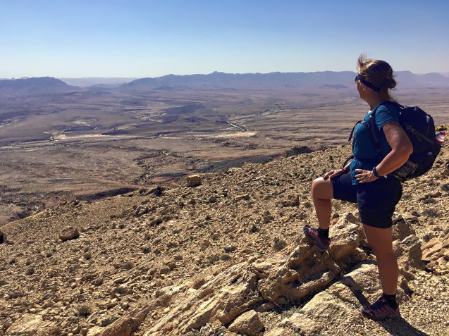 The sunrise from our hut was really nice but it was still cold so we holed up inside until the sun came out in full force. After enjoying our yogurt, granola and bananas we packed up and headed the other way out of town on the Israel trail. The first 5 km are very scenic, overlooking the Maktesh Ramon (Ramon Crater) but after that….it’s just desert. We met one girl who passed us going the same way and a friendly man going the other plus one vehicle. Oh, and a hare that hopped away before I could get a picture. So, yep….it was quiet.
