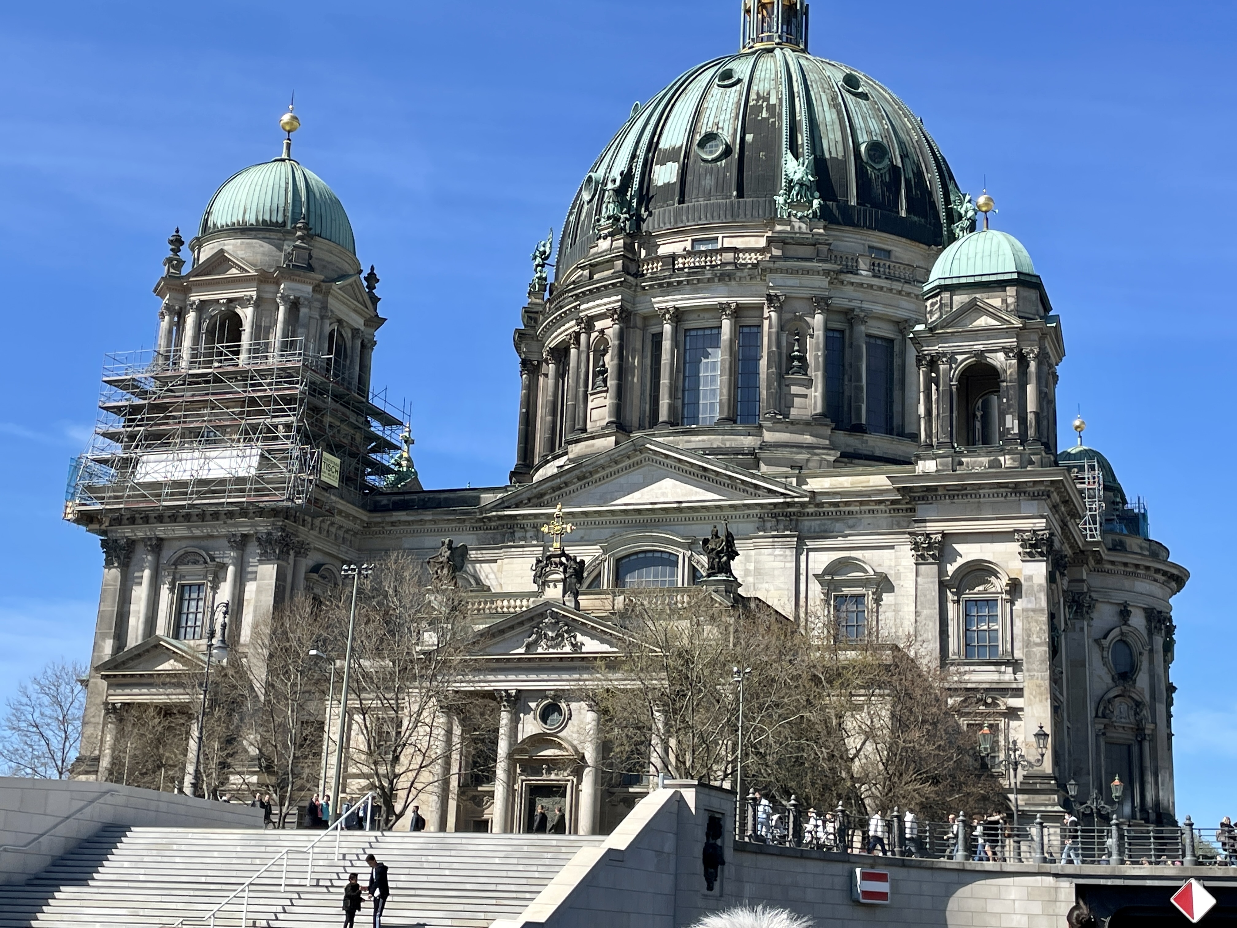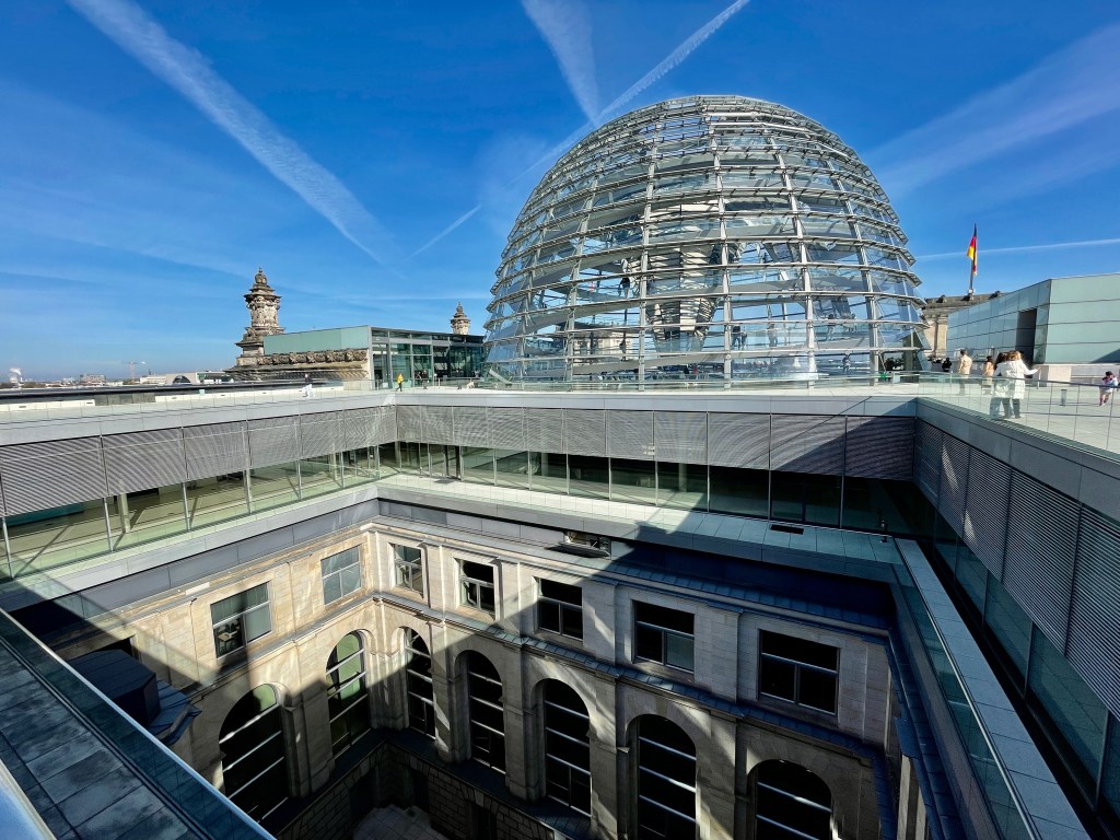 Monday: Sue and I had finished breakfast and were on the train shortly after 8 so we could get to the Bundestag for our 9 am reservation. It’s free but you must register in advance. Once there we encountered more security than the airport and even had to wear an FFP2 mask. Thankfully we had one.