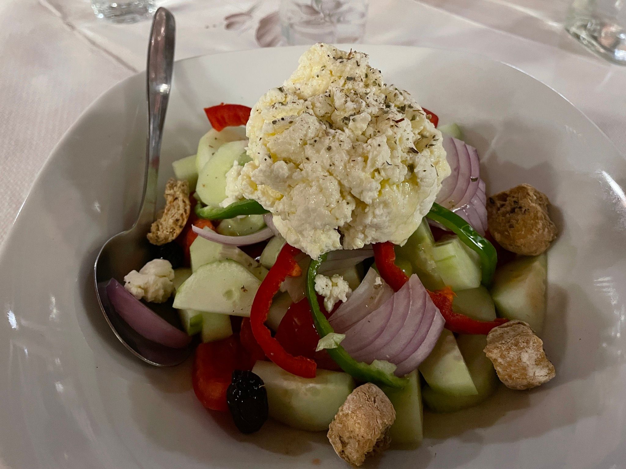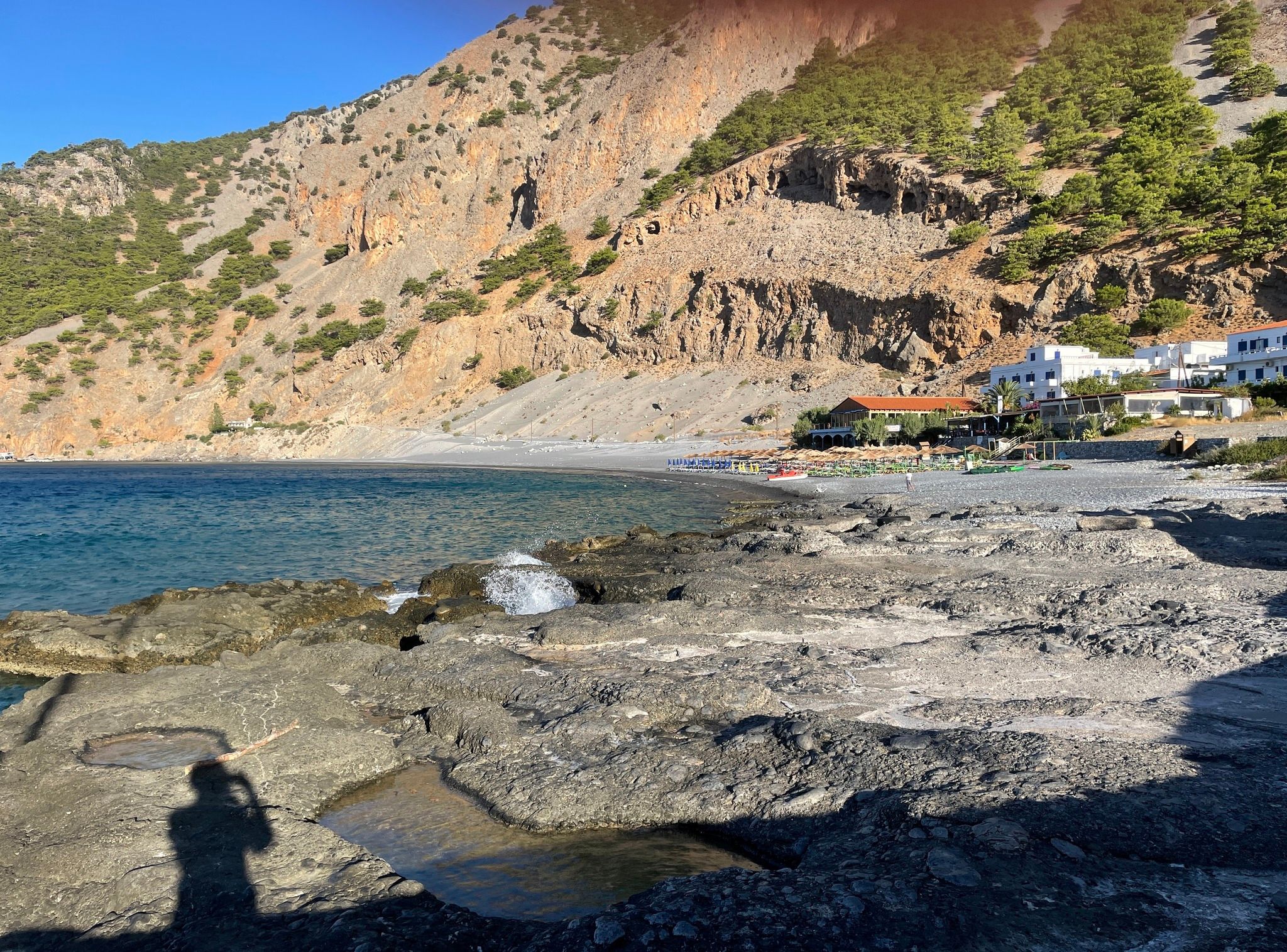 We opted not to hike the gorge as we only had the afternoon and it’s soooo hot. It would have been nice to start it first thing in the morning but that’s not an option with a one night stay. Those who did it said it was nice but there were a LOT of people so we’re glad we spent the day on the beach instead. 5 euro each for a chair and a free drink was a bargain. Swim, read for a bit and swim some more in the beautiful Mediterranean Sea was a perfect use of time. For dinner the Cretan salad was delicious