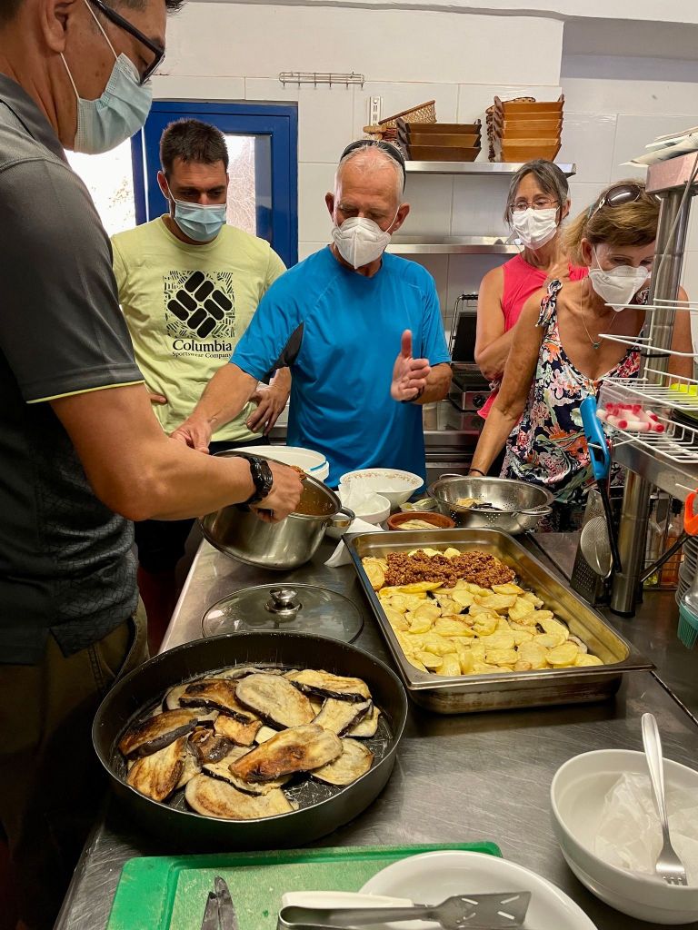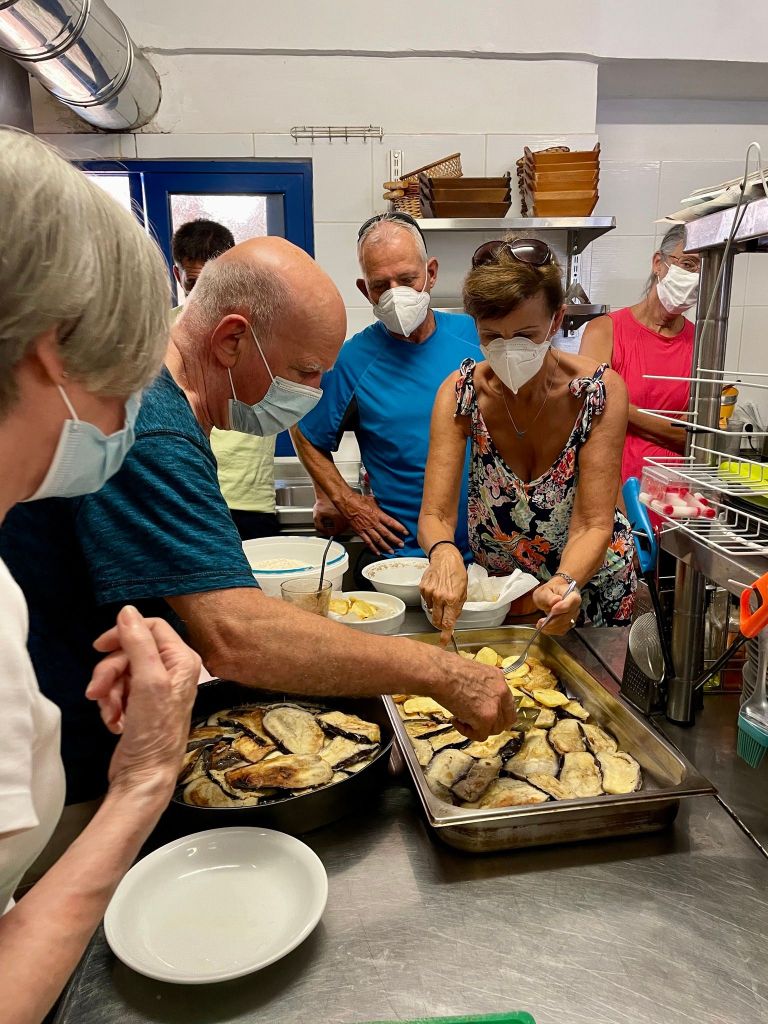 Wednesday. Pavlo picked us up in his boat with his dog Shakira and took us to Likos bay where he spent a couple hours teaching us to make moussaka. While it was baking we walked the beach and did some swimming. He served us a delicious salad and the moussaka. Twas good but making it is a LOT of work. Rather than have him boat us back we elected to walk back. Took about an hour and by then we were hot so went to the far end of Loutro for a swim. After cleaning up we went back to town and watched the sun go down while enjoying a cocktail.