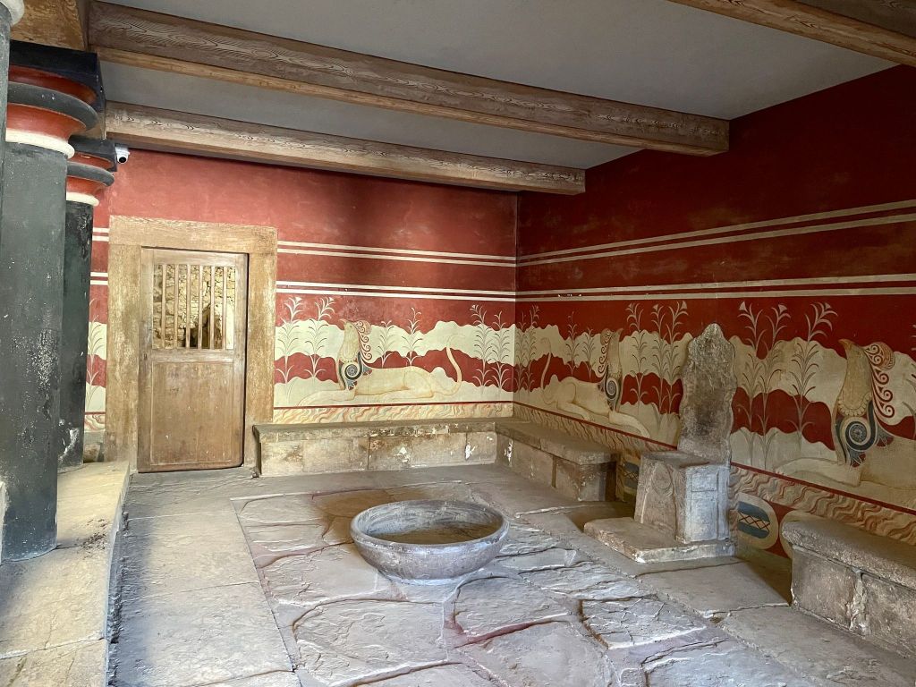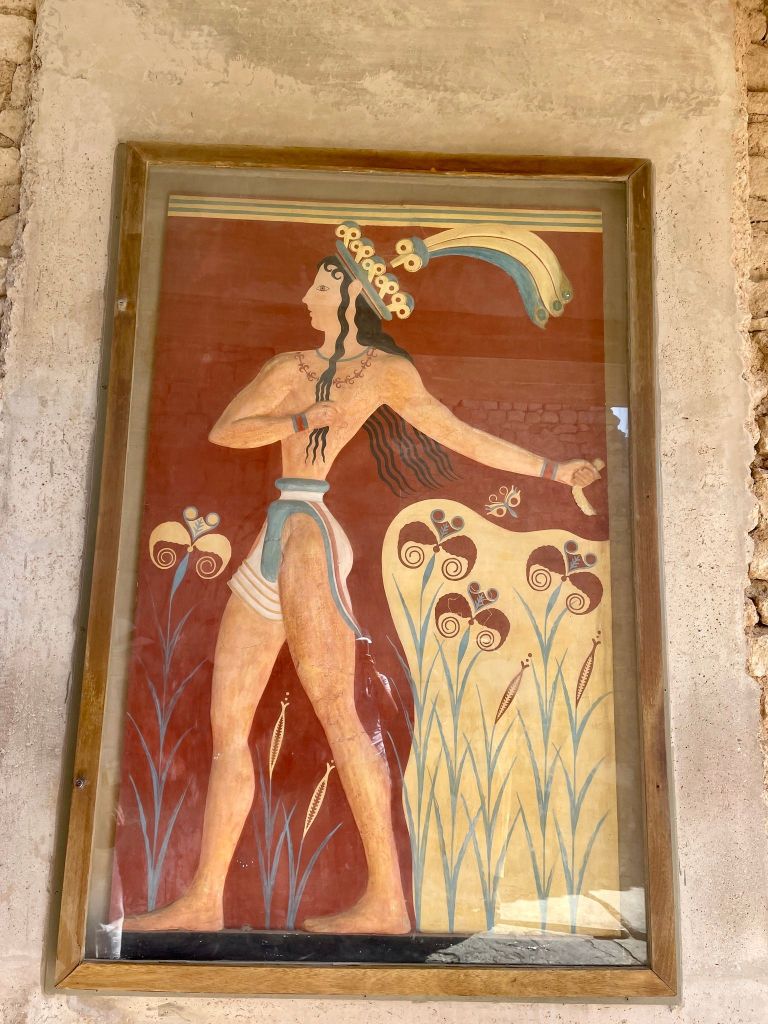 Thursday. A ferry to Skalja where Dmitris picked us up in the bus. He drove up and down the mountains to drop us off in Heraklion. There we visited Knossos. These ruins date back to 2000 years before Christ. It was destroyed by earthquakes and fire started in the stored olive oil. There is still evidence of that fire. Some of the pottery is original and intact as well as a few paintings. They even had a sort of flush toilet back then. Amazing! After taking the bus back to the city we wandered till we found a place that looked like it had good food and filled up on veggies. That is not difficult in Greece. Every menu has an assortment of delicious salads.