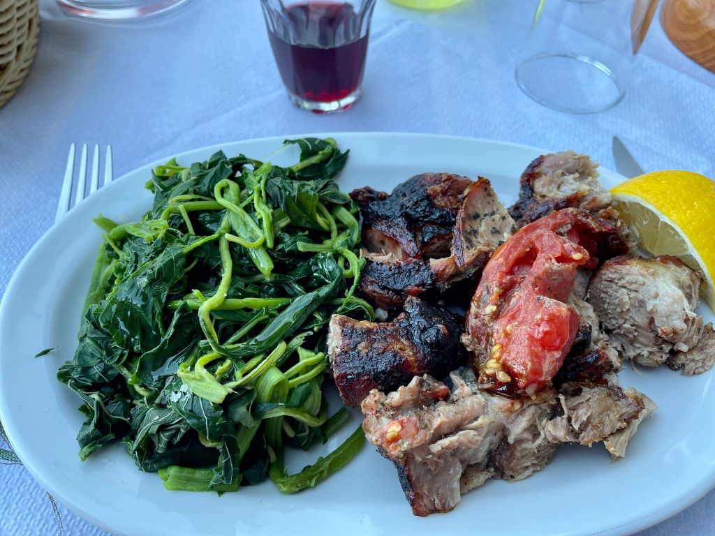 Dinner was at a restaurant we’d walked by where we’d seen a man bbqing all day. The pork on a spit was amazing. The portion of greens is apparently often just picked in the wild. It tasted kind of like spinach but better. The whole meal was delicious. Well. Other than the obligatory finish of raki. We didn’t finish that.