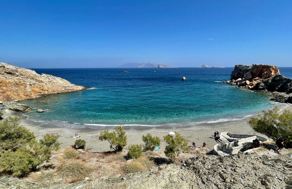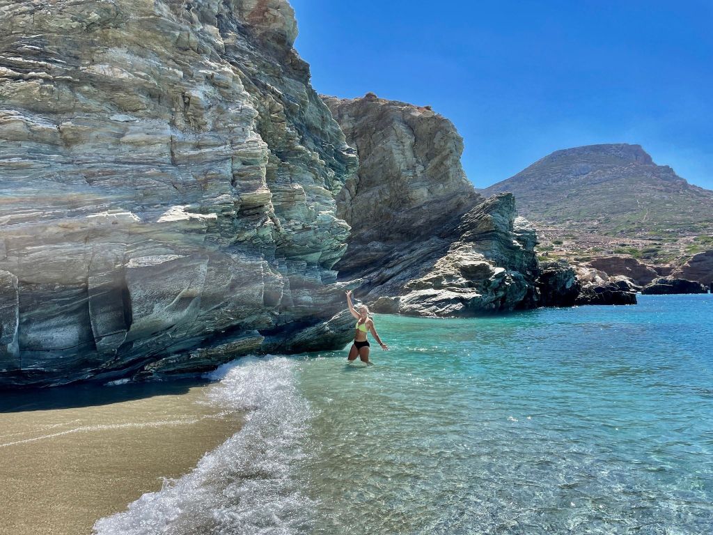 Next we set off to explore. Karavostasis is tiny so it didn’t take long. Vardia beach is beautiful but it was really windy so we went back to the harbour beach and spent the afternoon swimming and reading. After getting cleaned up we enjoyed dinner of local dishes at Syrma on the beach. I had an eggplant dish and Anita stuffed tomatoes. Both were tasty