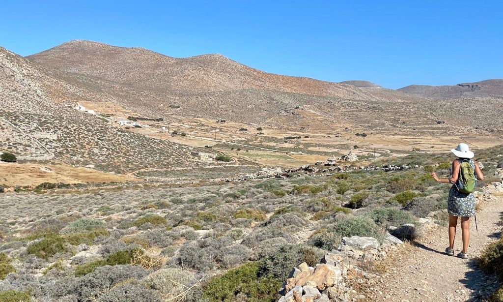 Wednesday. Walked to Katergo beach and on the way back met a man with a herd of goats so we stopped to chat. He was quite proud of his goats and told us all about Alina. She had been orphaned so he hand raised her. From Pakistan he dreams of going to Canada. After lunch at dal capo we caught the bus for Chora then on to Ano Maria. Not much to do there so after wandering a bit we had second lunch. First one was fruit salad and this one was Greek salad so we didn’t feel too piggish. Lol