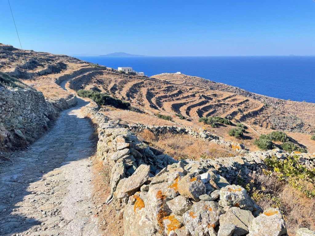 Tuesday September 13. The nice thing about a room with a kitchenette is being able to make coffee and a simple breakfast in the morning. Saves money too. We caught the bus to Chora then noticed a bus to Agkali beach so we got on that one. The windy, narrow road to the beach looked treacherous enough for a car never mind a bus. Once there we found the path to the next beaches Galifoli (where the naked people seem to hang out) and St Nikolaos. The hike was just over a kilometre but some areas were pretty intense. After enjoying a swim and some relaxation we took a shuttle boat back to Agali. It was actually the nicest of the beaches anyway. After another swim we caught the bus back to Chora. We splurged on lunch. Anita had the swordfish and I had stuffed squid. Both were delicious.