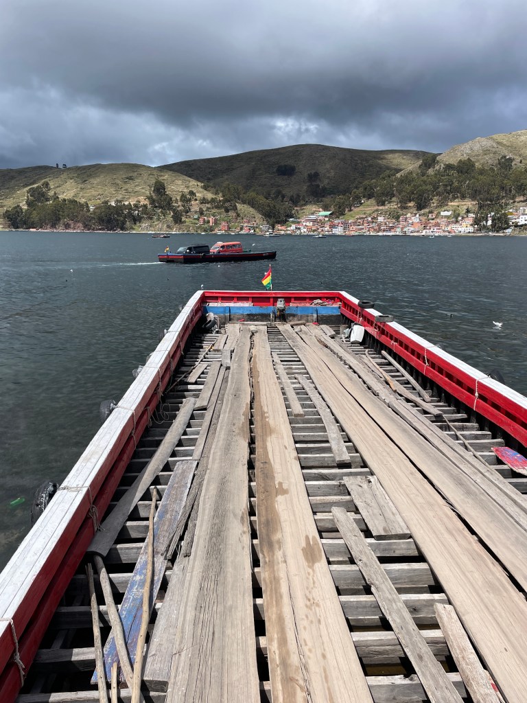 We met the others and boarded the bus again, this time for Copocobana with various stops along the way. To get there you have to cross a straight where the bus is taken on a ferry. We wondered why we had to get off and take a different boat. Then we saw the ferry. Wow, that’s different.