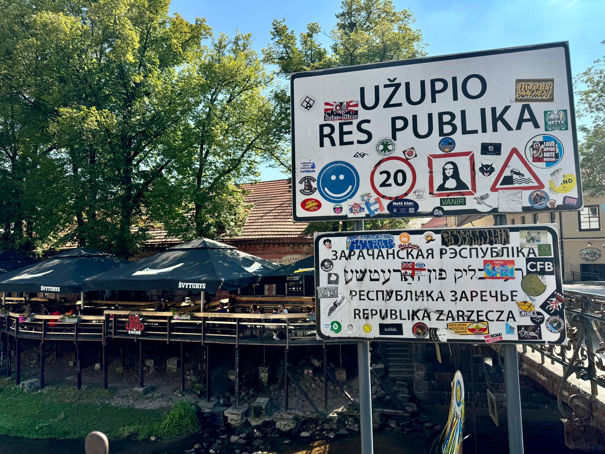 Today I spent some time visiting the republic of Uzupis. Population 7,000. An independent republic has to have money, power, an anthem and constitution, and above all, a free spirit. So. They made sure they have all this. The constitution is posted on a wall in town in about 40 languages. The sign on the border orders you to drive only 20 km/hr and smile. 😊 Well. I noticed speed limits exceeded and the usual grumpy faces. Oh well. It was interesting
