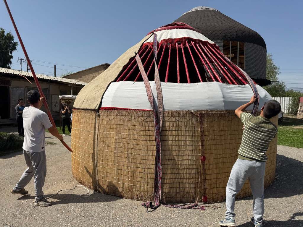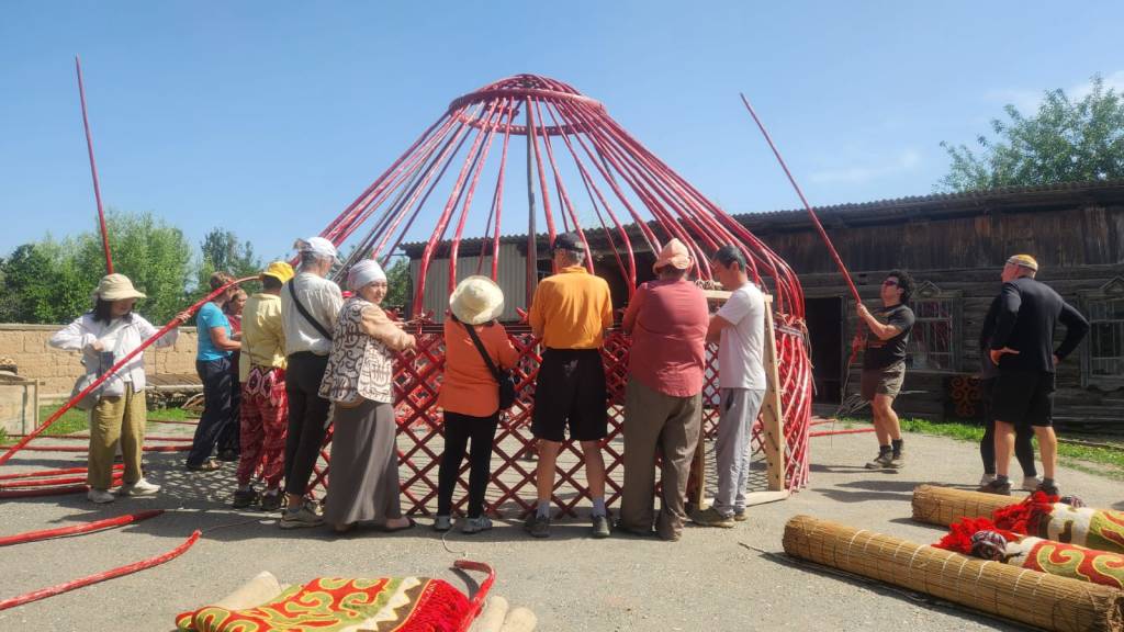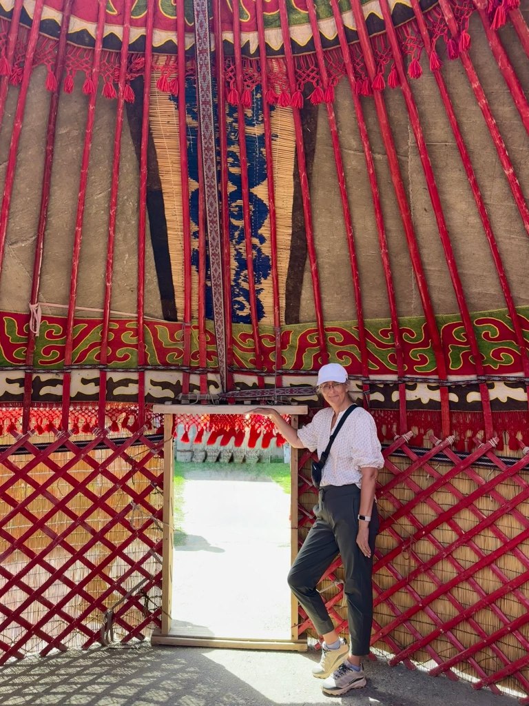 Saturday. Our first stop was at the Ak-Orgo workshop centre where. The man who started it has passed but his son and daughter in law have taken over. They’re doing a great job of making sure the old skills are improved upon and passed on. They showed us how they use wool to make various crafts out of felt. Yurt building was next. The structure is made of willow and the covering is felt. One piece they put on was made in 1967!
