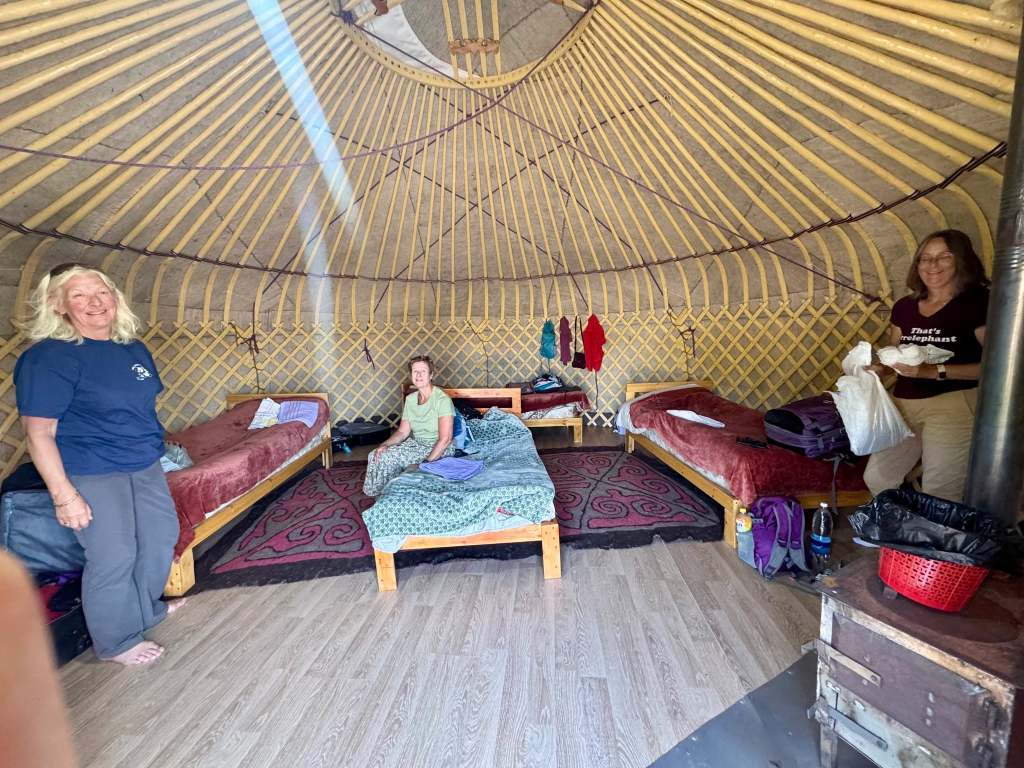 Yurts are heated with wood stoves when it’s cold but not this time of year. Though it got down to 8-10 degrees, we were snug in the cozy beds covered with very heavy quilts. Thankfully the dogs stopped barking eventually and we all slept well.
