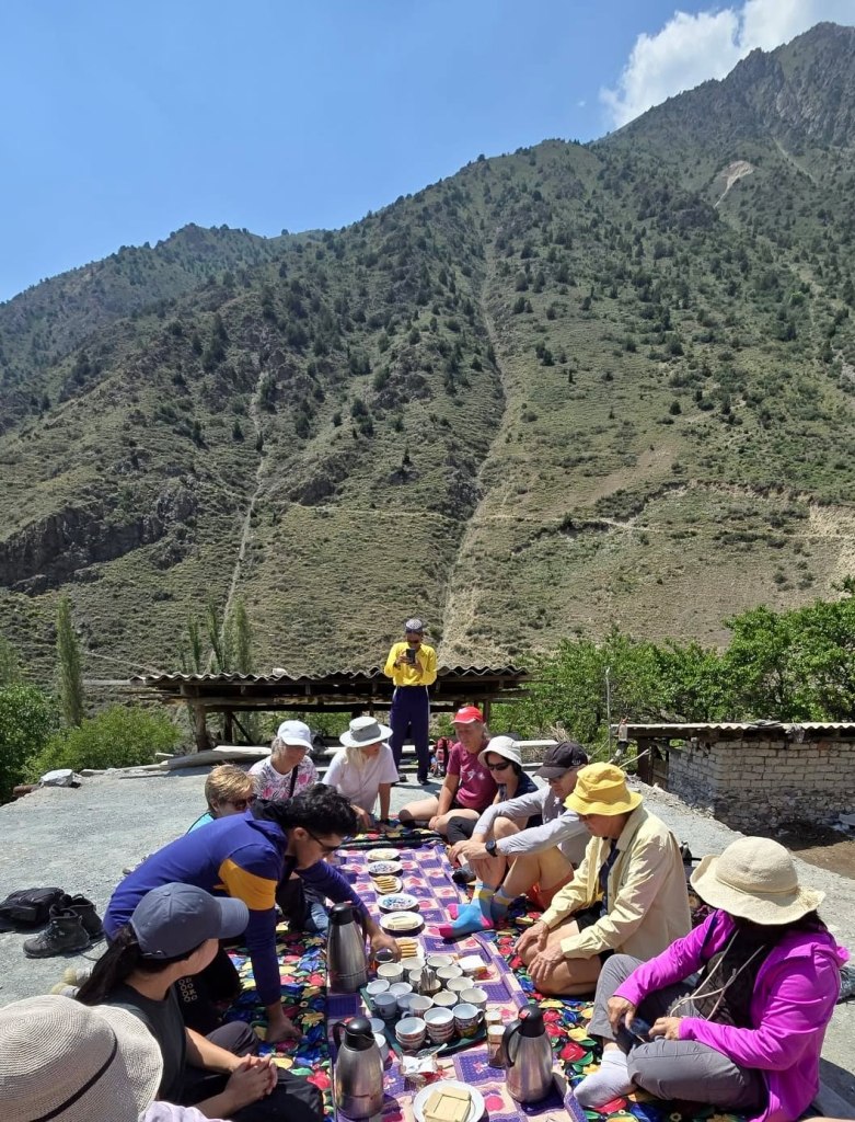 Upon arrival in the village of Ghazza, we checked into the Community Guesthouse Begmurod. Rooms are large and shared by 3 or 4 people. They’re very nice and the showers are great. I slept so well the 2 nights we spent there. There’s no cell service or wifi so it was a great “detox”. After our hostess served us a tasty dinner, some of us gathered and played games that Karen had brought along. Great fun!