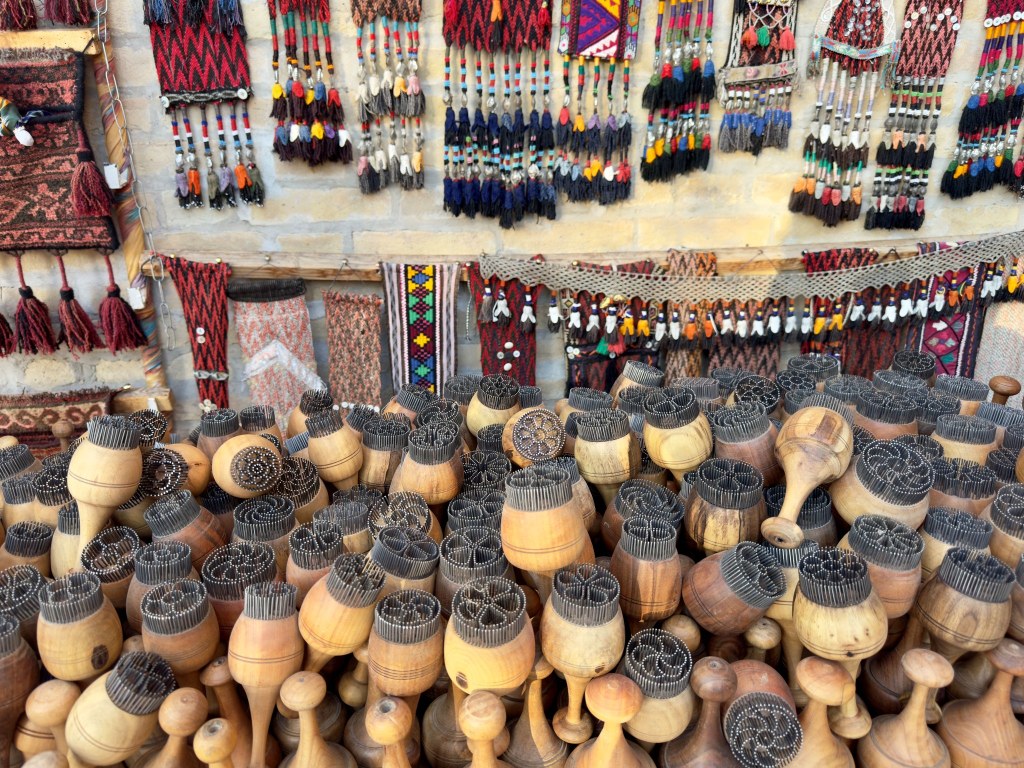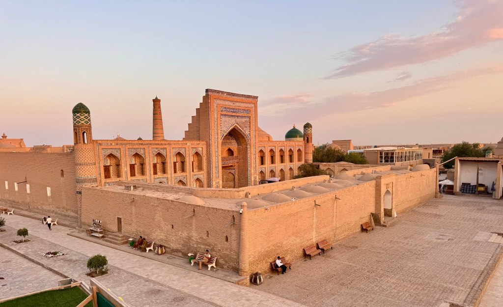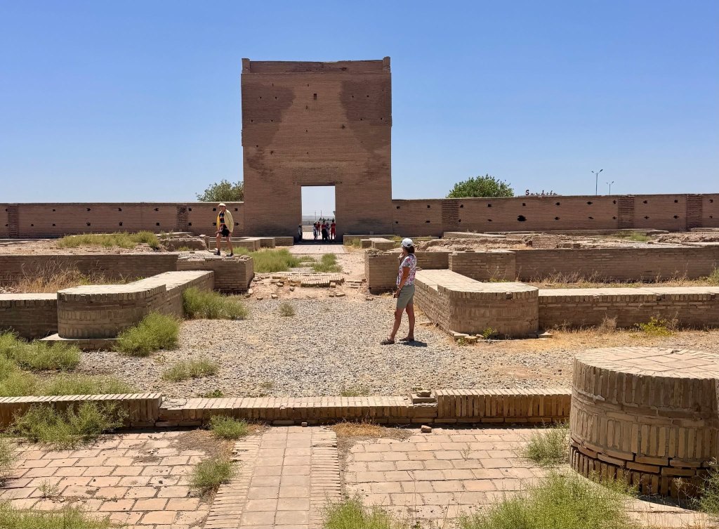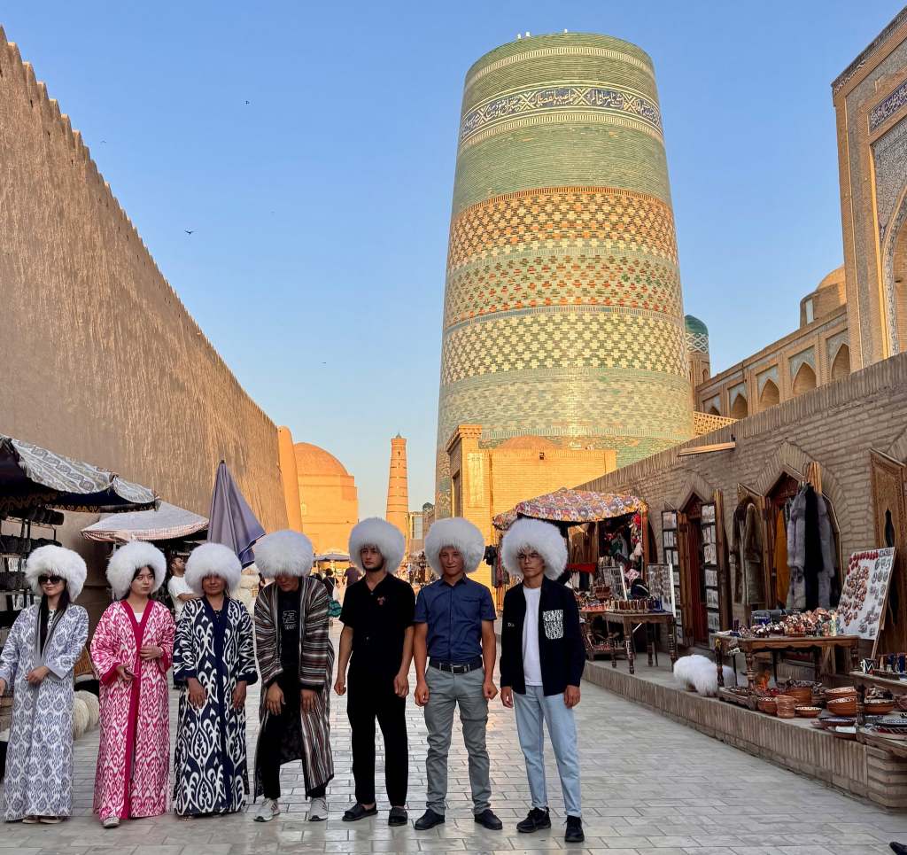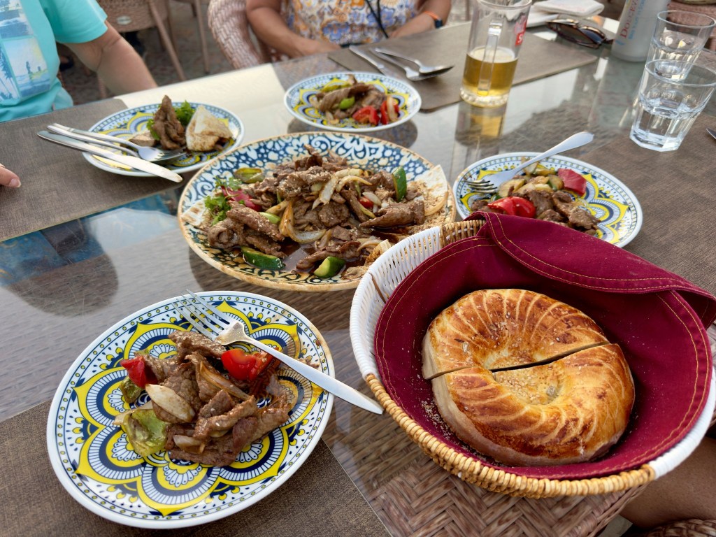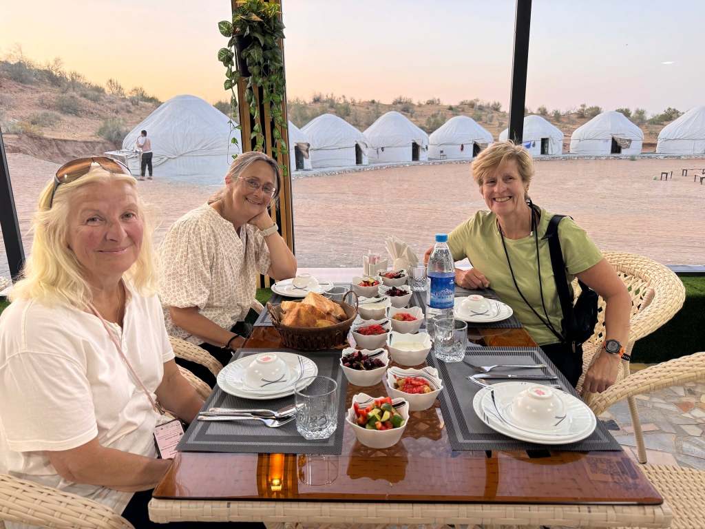 After that we wandered around inside and outside the city, moving slowly due to the heat. Many places close in the afternoon so there aren’t many people out and about. Back at the hotel we met with the others and our new tour leader. We will say goodbye to Lilia and a few of the group members. Aygur will guide us into Turkmenistan. It’s complicated so that took so much time we didn’t get to climb the wall as we’d hoped. So, Jane, Sarah, Anita and I found a place to eat dinner on a roof top with a view of and over the wall. Win/win.