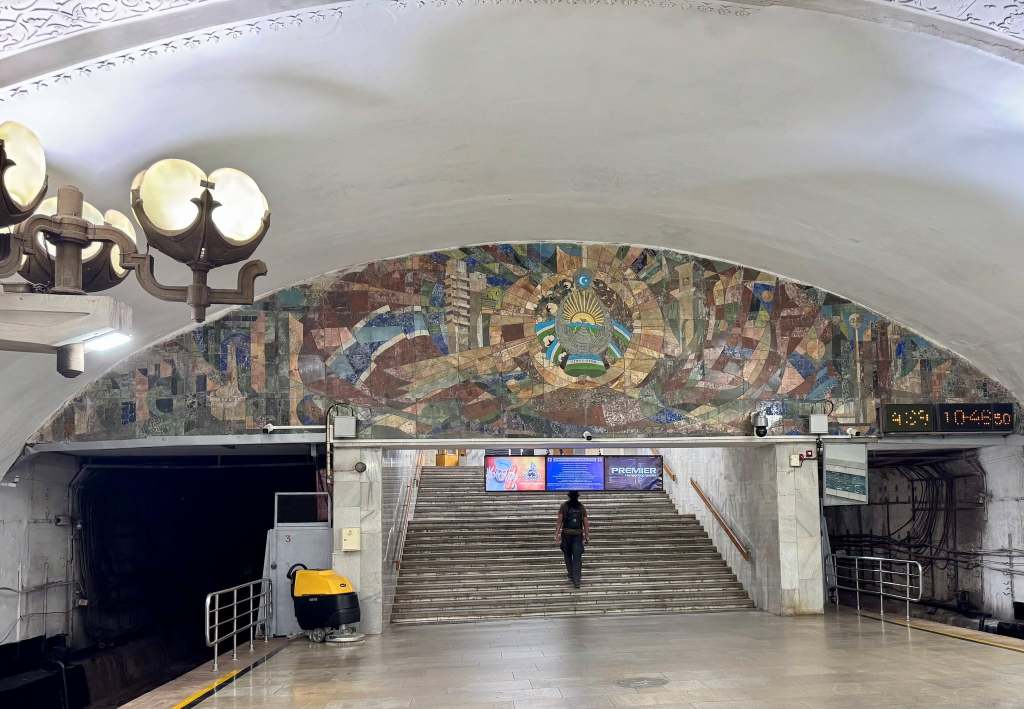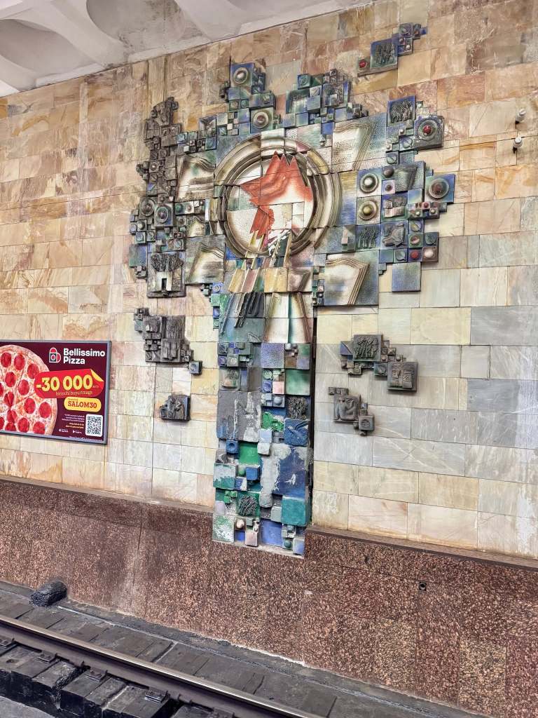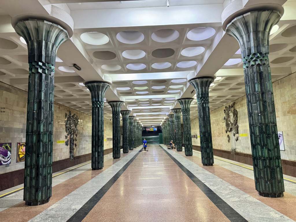 We decided to do the least strenuous activity we could think of and walked to the nearest subway station from the bank. The next few hours were spent getting on and off the trains, exploring some of the beautiful stations. The system was built after the massive earthquake of 1966 destroyed Tashkent. Since it was technically a military location (bomb shelter) photos weren’t allowed until recently.