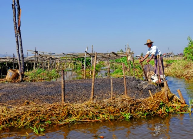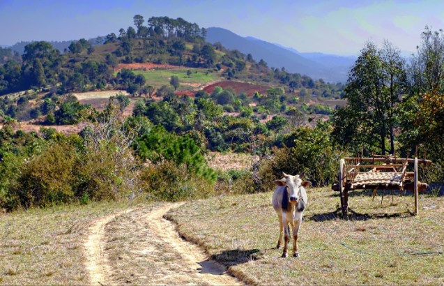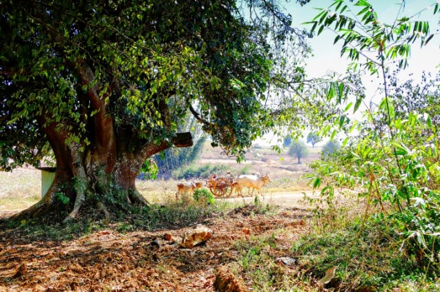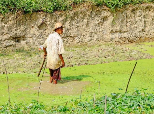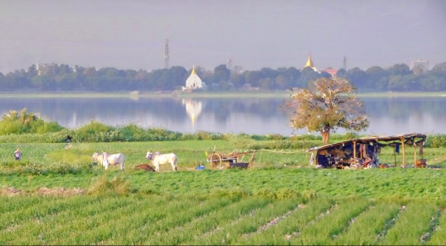 Fish pond, rice fields and the jungle in the distance