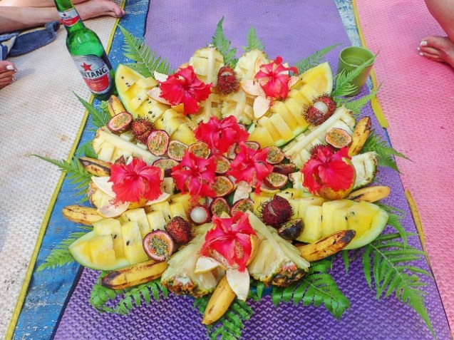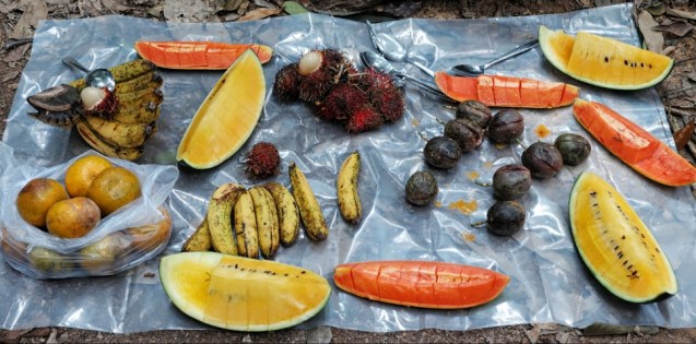 Our guides from Bukit Lawang Eco Travel outdid themselves on the food. Lunch on the trail was nasi goreng in a banana leaf with cucumbers and tomatoes and a quarter pineapple each. It was delicious! Dinner at camp was a smorgasbord of dishes including pumpkin curry, chicken, potato patties, sweet potatoes, etc as well as more fruit. We enjoyed passion fruit, rambutan, pinapple, watermelon…..such an assortment and decorated with flowers too.