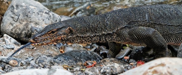 After settling in, settling finances and trying to repack for our trek the next day, we set out to explore. Further up the path in the village we found steps to the river bank and followed the path for a while. Across the river we saw a big group of macaques and a huge monitor lizard. That bodes well for wildlife sightings!