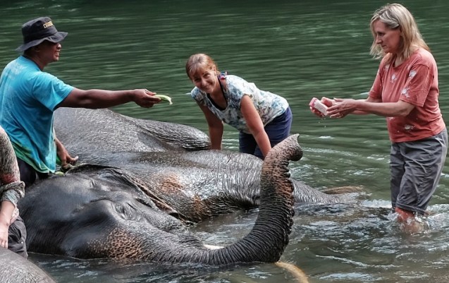 After being given brushes we all found an elephant to scrub as they lay on their sides in the shallow water, like kings waited to be bathed. The mahout had them roll over and we did the other side. Later we were each given a bag of bananas and other food. I ended up being one of the last with food and was slightly mobbed by hungry elephants. They’d have food in their mouths and trunk and STILL be looking for food. There was one baby elephant that we were told to watch as he was very “naughty”. The little guy was everywhere, sneaking food where ever he could.