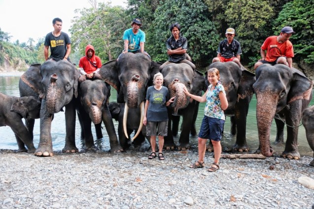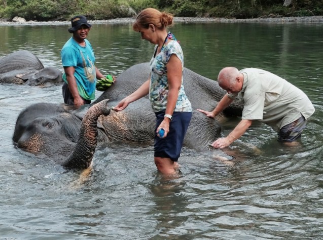These elephants were originally used in the illegal logging of the jungle. Once that was controlled they had no job and no jungle left to release them into. A couple of them came from Northern Sumatra where they too had been worked. The only choice was to let them starve for find a job, a way for them to earn their keep. Tourism works and it seems very ethical and well run to me. Make your own choice but it looks like everyone’s making the best of the situation to me.. They aren’t asking elephants to do anything they don’t expect humans to do. I’d seen men carrying 100 kg loads strapped to their heads and shoulders for 2.5 hours up river so the tourists can stay comfortably in the jungle.