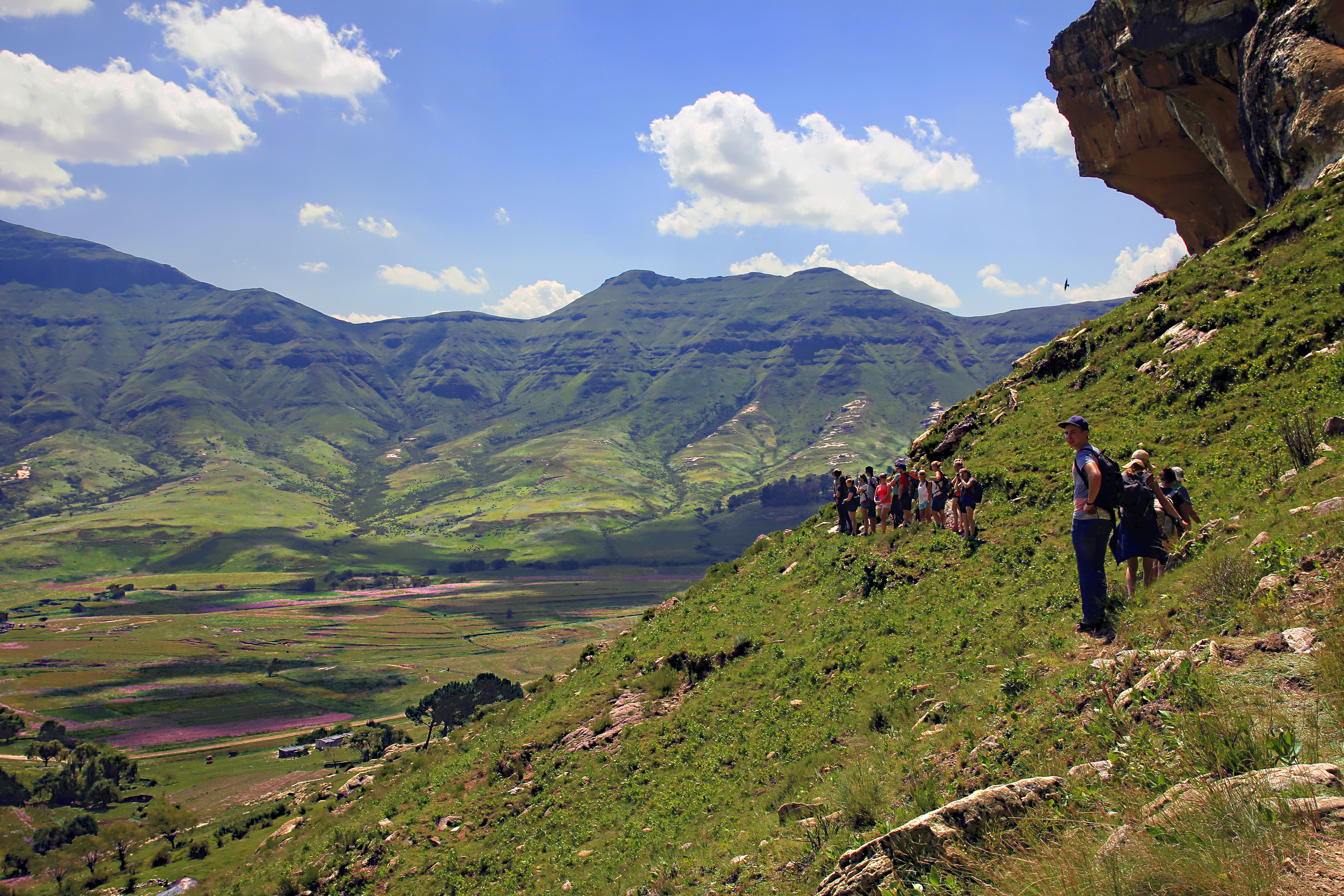 After a 3 hour drive we arrived at the South African border where we got our exit stamp. The Lesotho border office wasn’t operational yet so I guess we entered the country illegally. After driving a big longer on really bad roads, we stopped at a school sponoroed by the lodge and got some info from the Vice Principal. Next we started our hike. Again we were told it’s an “easy hike”. Right. We still found ourselves rock climbing and hugging cliffs. I REALLY wonder how many AFRICANS do these hikes? The Basutu kids must have thought there was something wrong with me as they RUN and play on these paths and I was terrified.